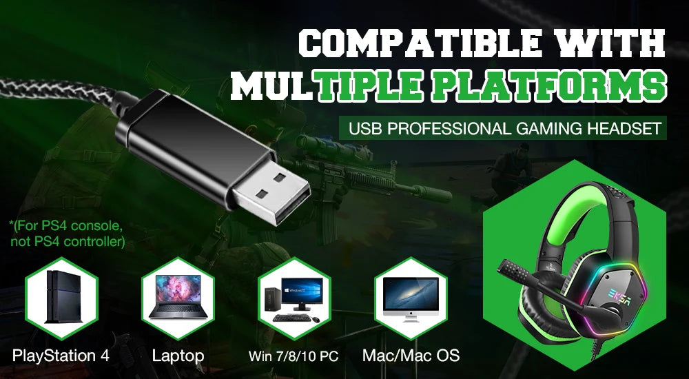 Experience immersive gaming with the EKSA E1000 wired headset. Featuring 7.1 surround sound for precise audio, an adjustable noise-cancelling microphone for clear communication, and a self-adjustable headband for comfort during long sessions. The RGB LED lights add a stylish gaming vibe. Compatible with PS4, PC, Laptop, and MAC.